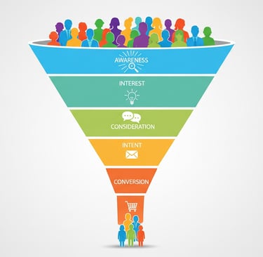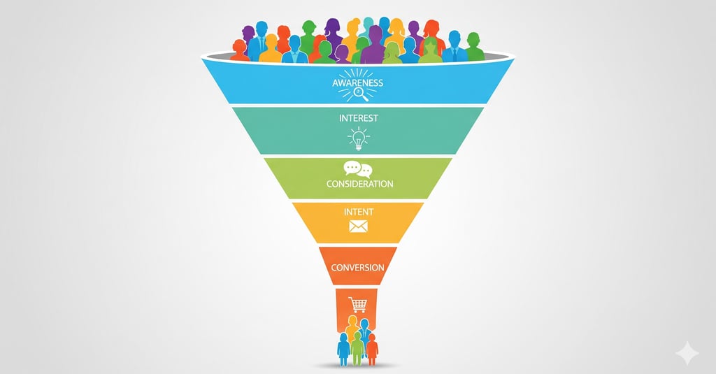 Think of it as a pathway: at the top, lots of people discover your business; in the middle, fewer people show real interest; at the bottom, a smaller group takes action and buys.